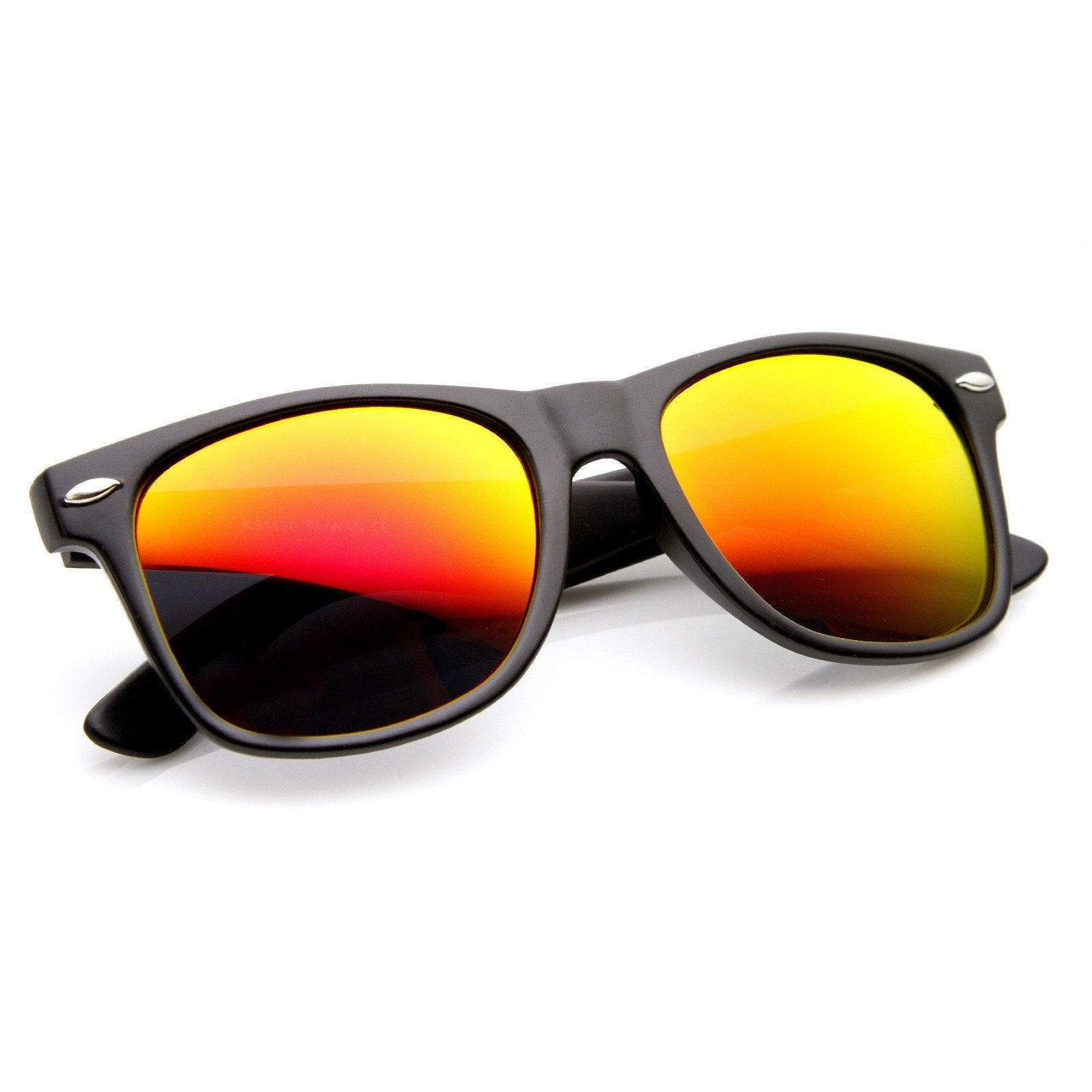 - Large classic horned rim design that features eye catching color mirror lenses and a smooth matte frame. Made with an acetate based frame, metal hinges and flash UV protected polycarbonate lenses.
