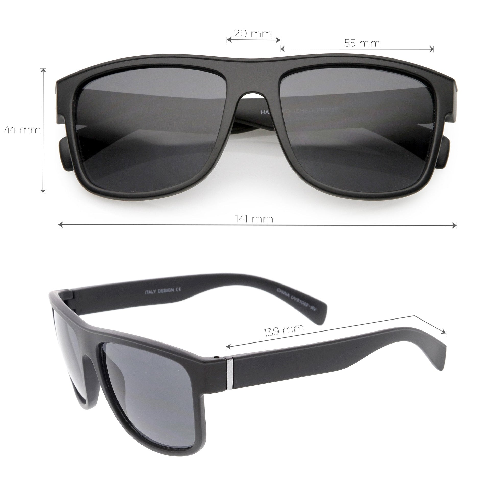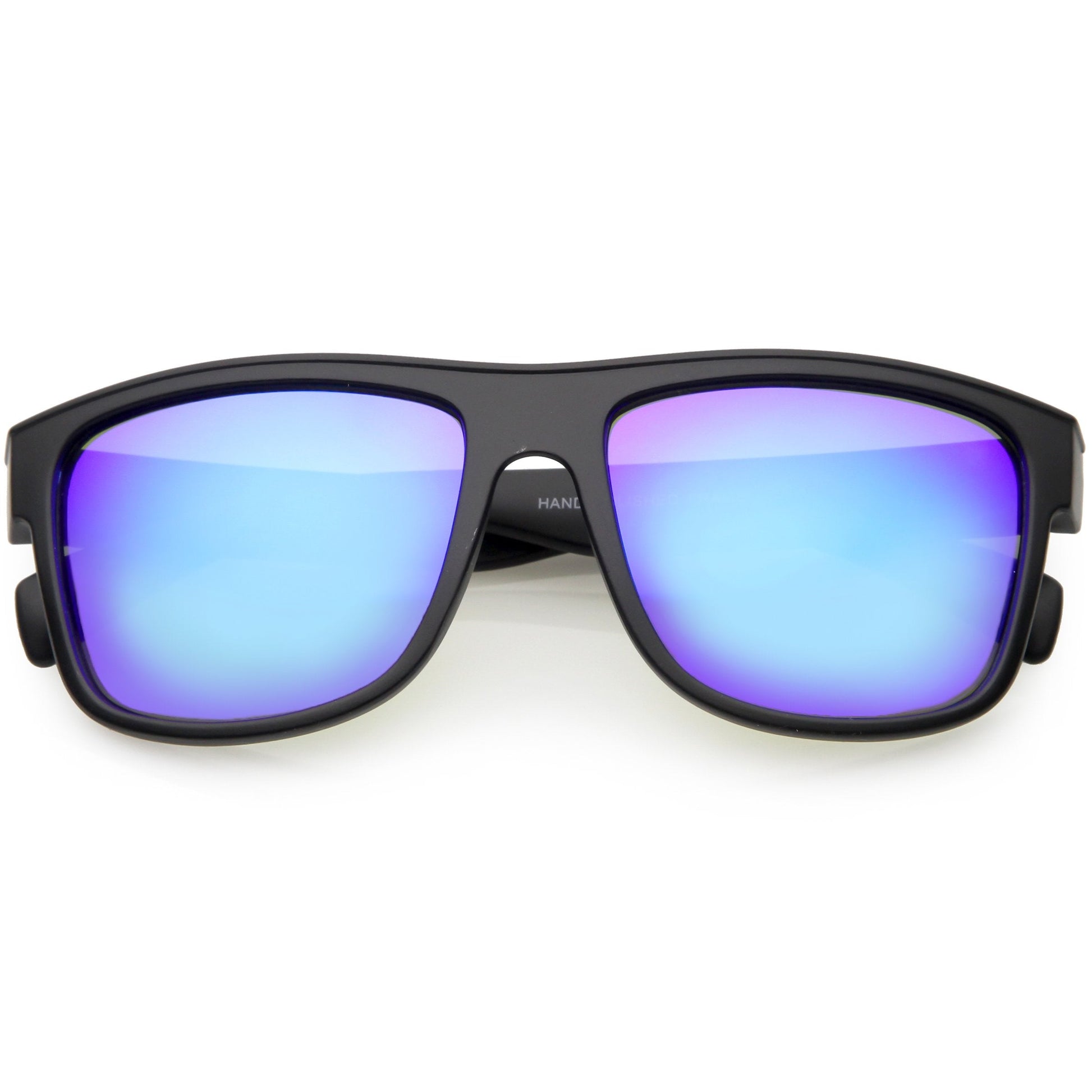 - Take this style anywhere with you! Featuring a square horn rimmed frame and wide arms, these horn rimmed sunglasses complete in matte and shiny finishes. Designed with a choice of mirrored or neutral colored lenses, these versatile sunglasses are a must-have style. Made with a plastic based frame, reinforced metal hinges, and 100% UV protected lenses.