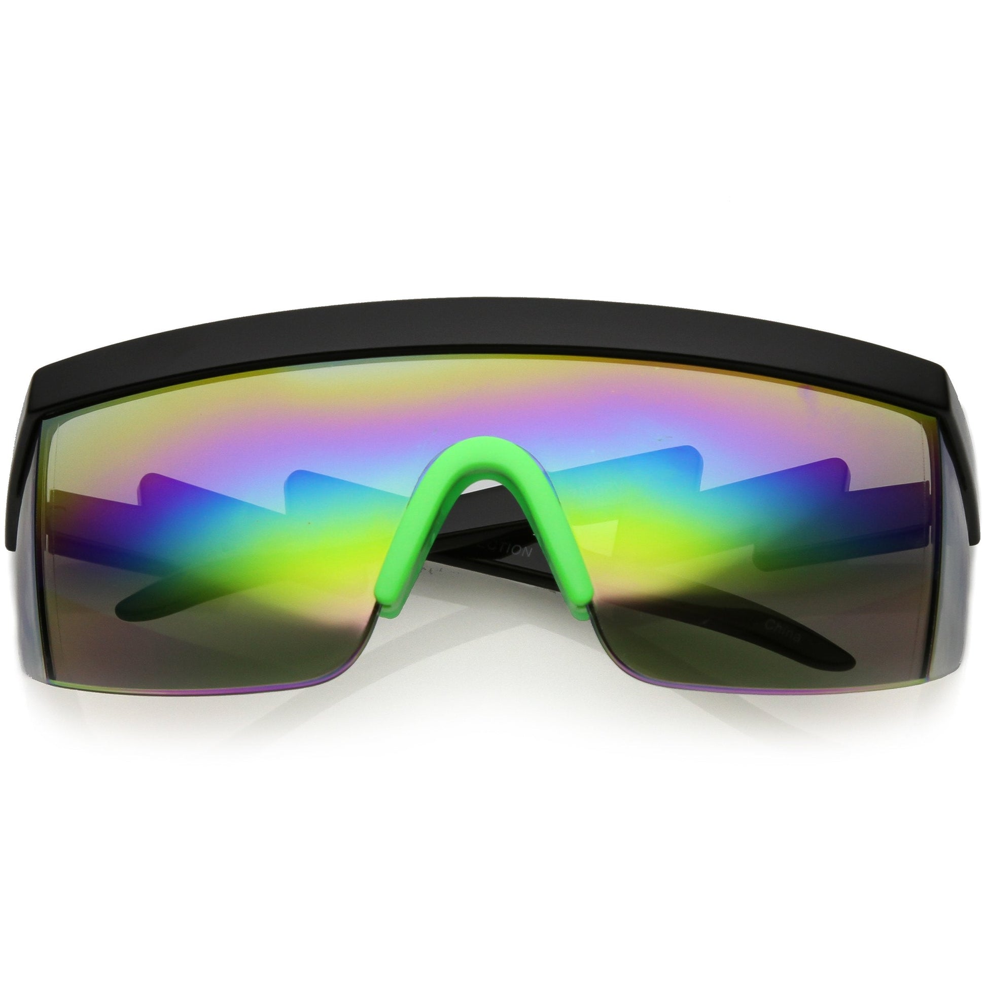 - Strap on those rollerblades and hit the street with these stunning goggle shield sunglasses exquisitely designed with a semi rimless frame, flat top, and unique zigzag arms for a lightning effect. Accented with rainbow mirrored lenses for an eye-catching look and non-slip silicon nose pads for a secure fit. Made with a plastic based frame, pin hole hinges, and 100% UV protected lenses.