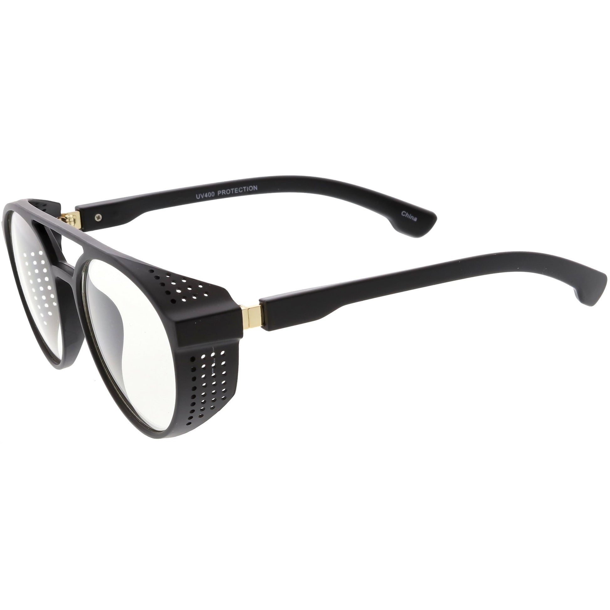 - Super rad vented goggle glasses with clear lenses. Choose from a variety of colors to complete that retro steampunk look. Each pair is produced and designed with 100% UVA and UVB protection.