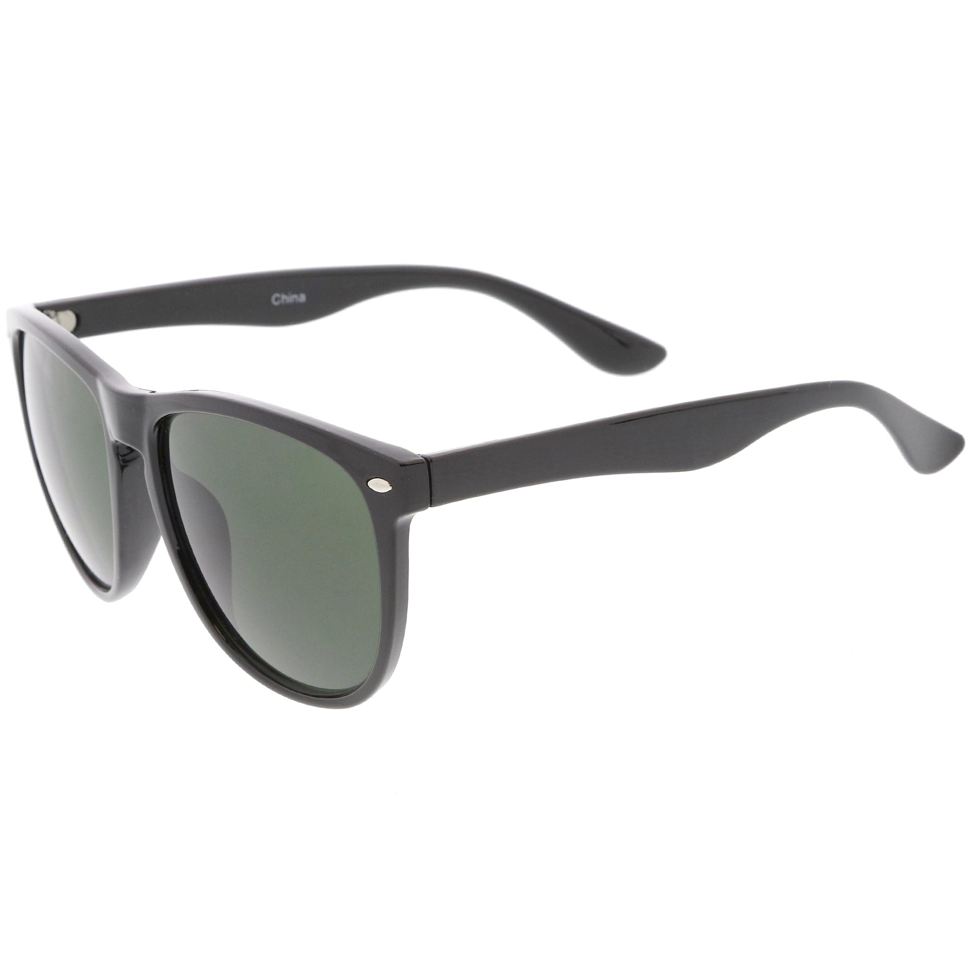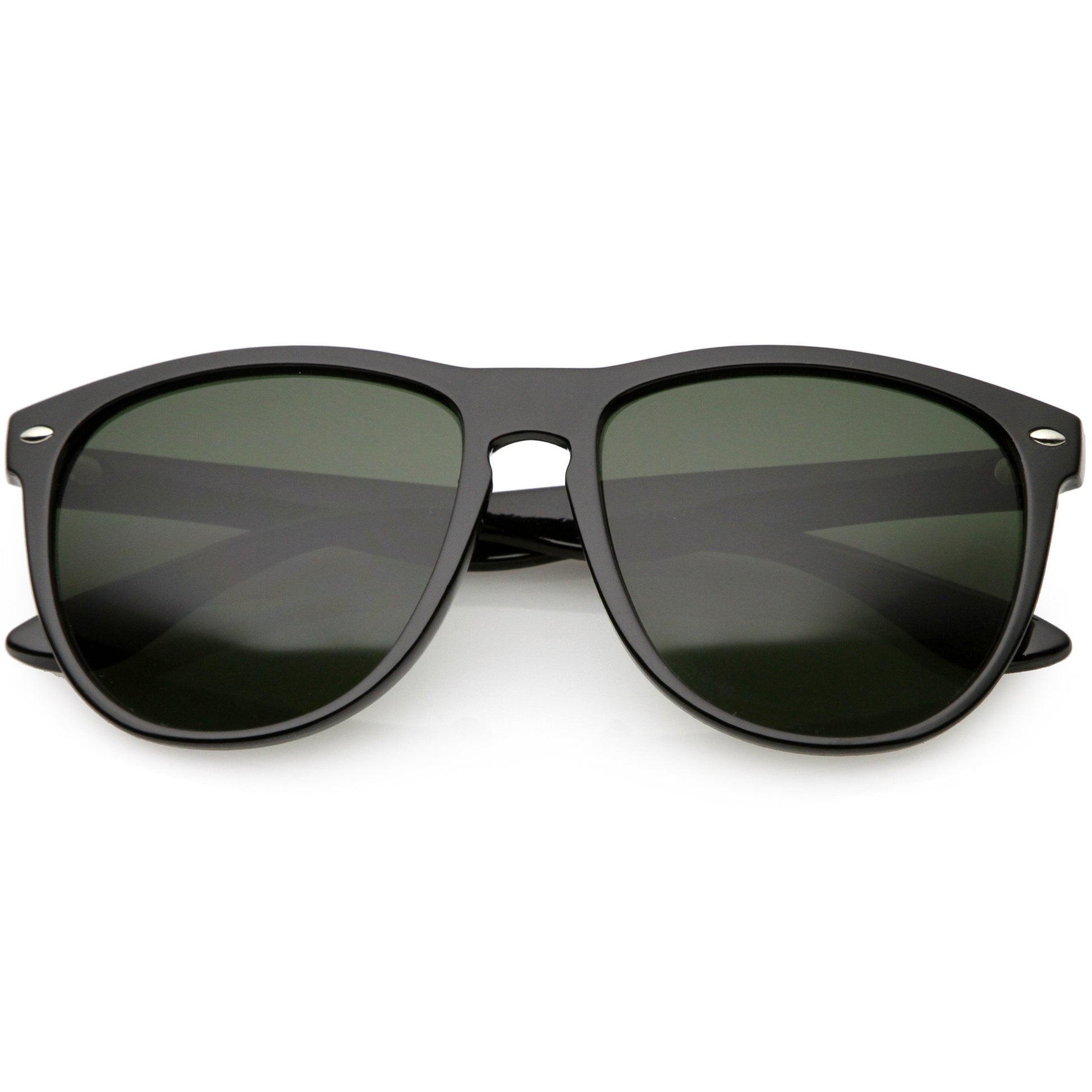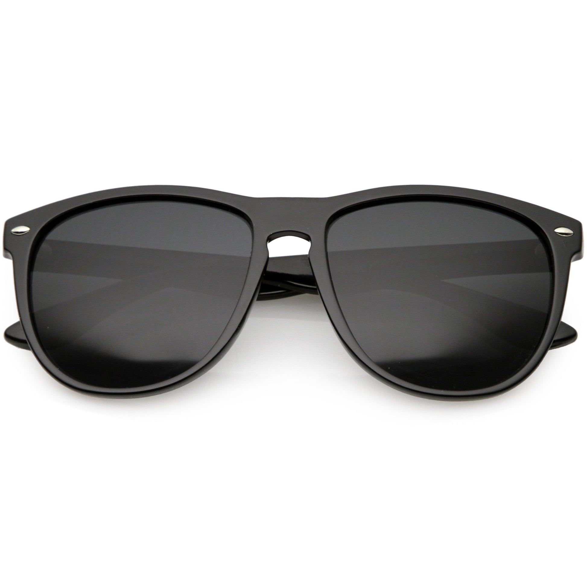 - A modern take on a classic design, these oversize horn rimmed sunglasses are exquisitely designed with a classic keyhole nose bridge and wide arms. Accented with metal rivet details on the front frame for added luxe, these are a great pair to take from the city to the beach. Made with a plastic based frame, reinforced metal hinges, and 100% UV protected lenses.