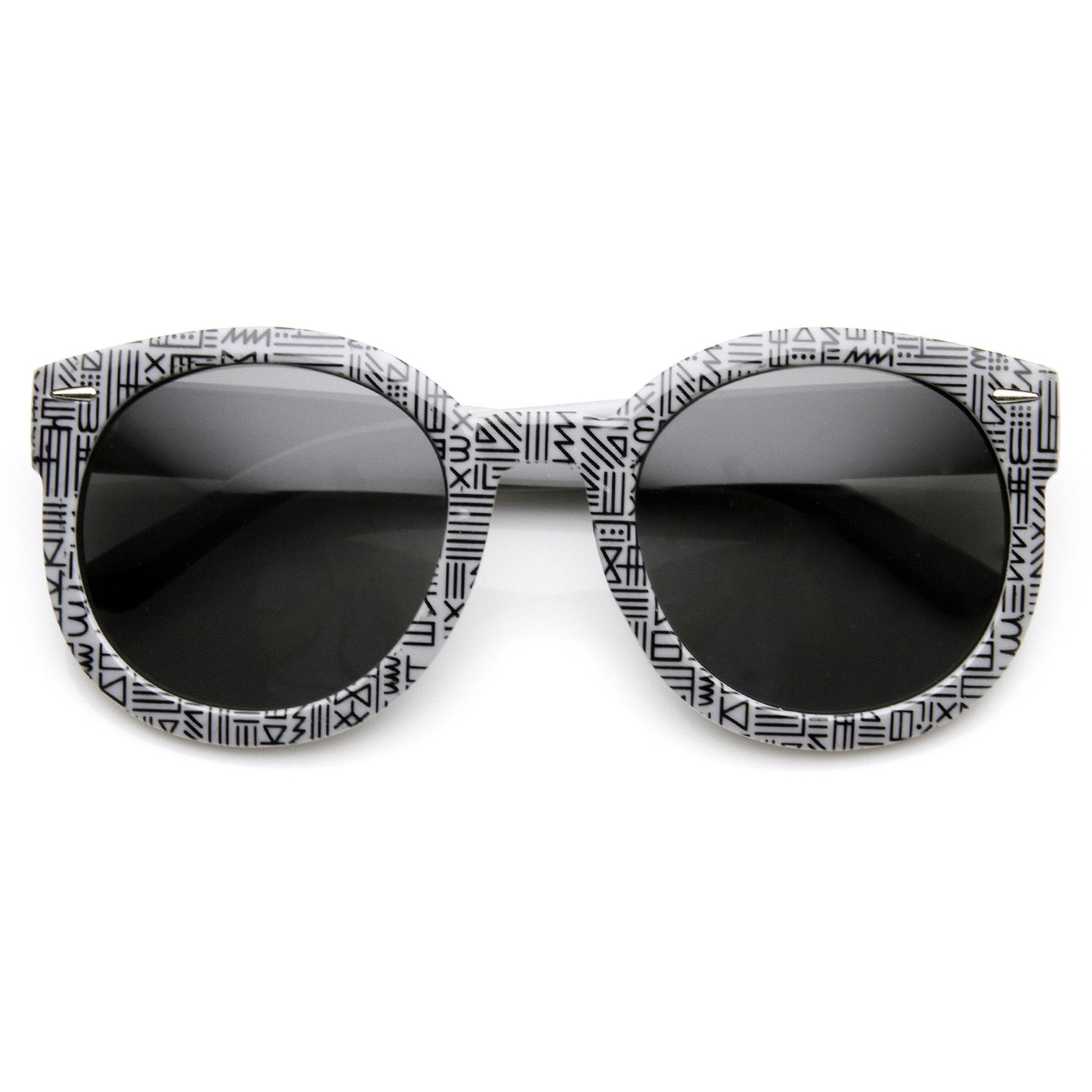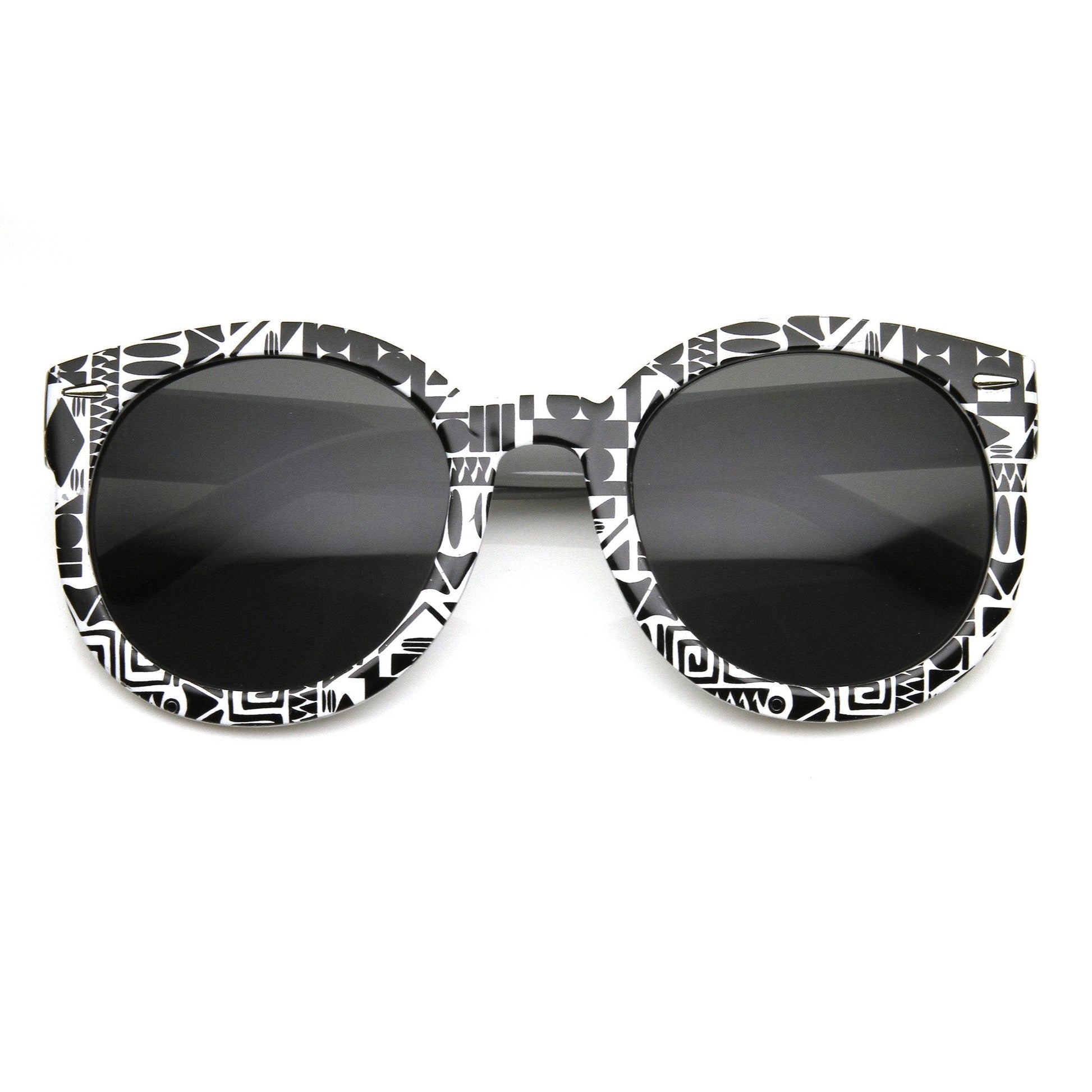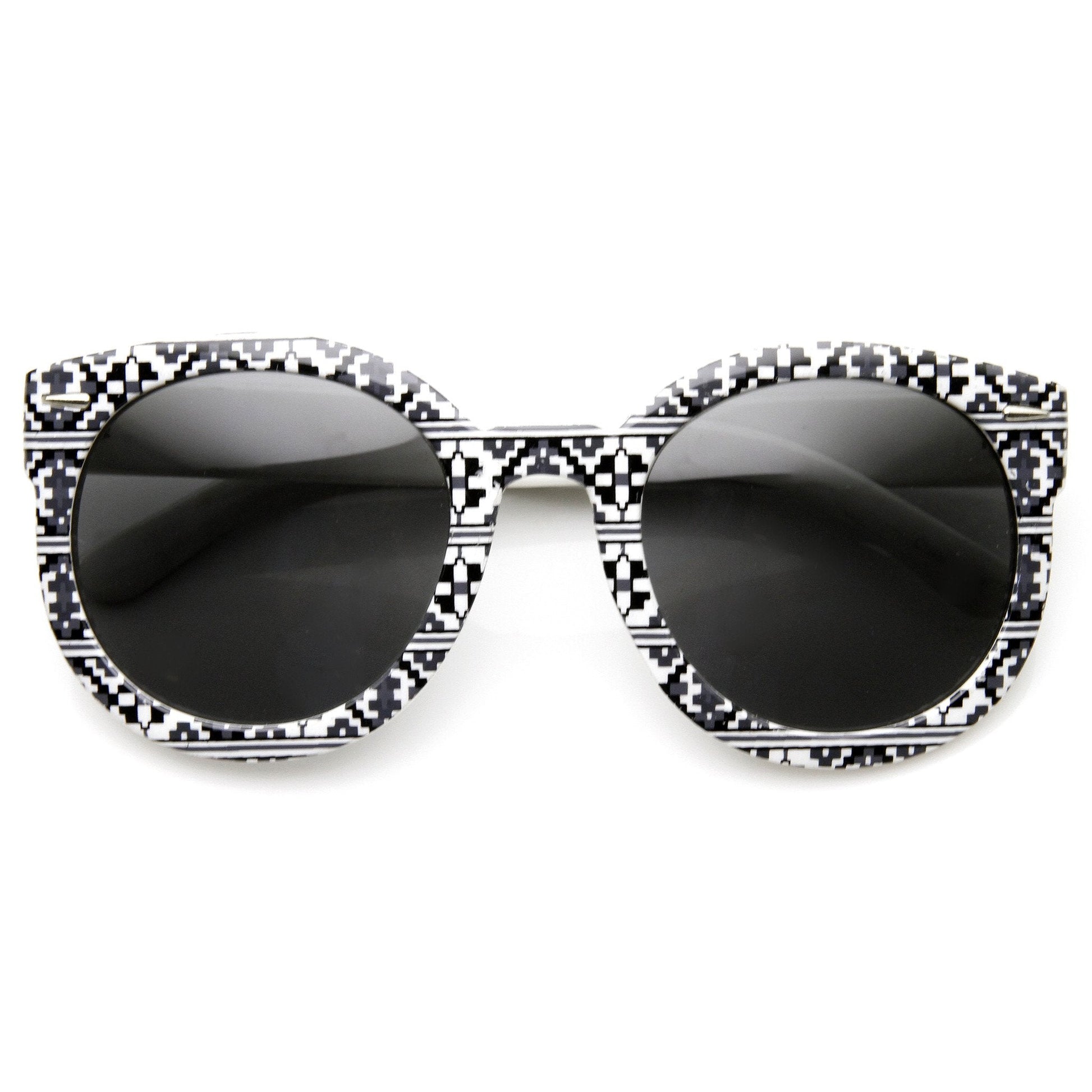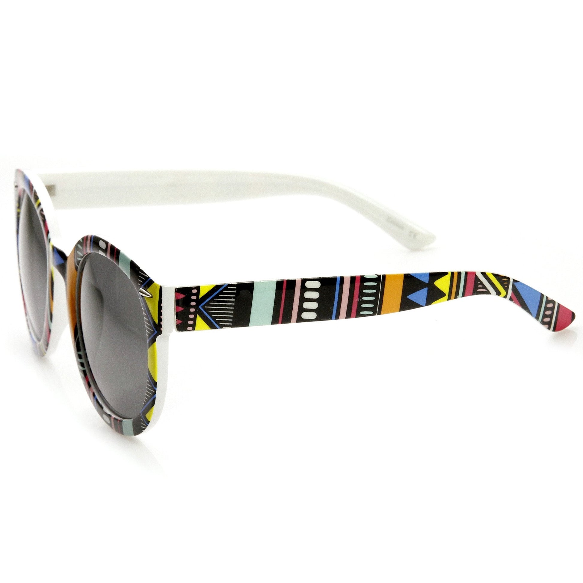 - Womens round oversized sunglasses that features a unique variety native print patterns. A must have for anyone who is a fan of fun native print styles! Made with a plastic based frame, metal hinges and polycarbonate UV400 protected lenses.