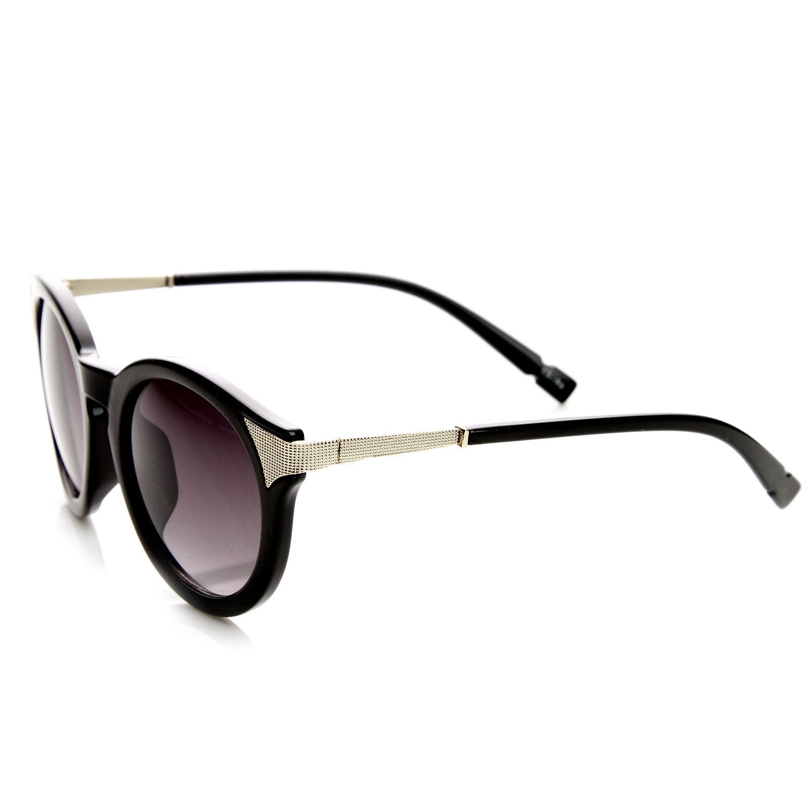 - Modified horned rim sunglasses that features a round circular frame with a key-hole nose bridge and elegant metal accents adorning the temples. A combination of classy and vintage style make these perfect for all the seasons. Made with an acetate based frame, metal hinges and polycarbonate UV protected lenses.
